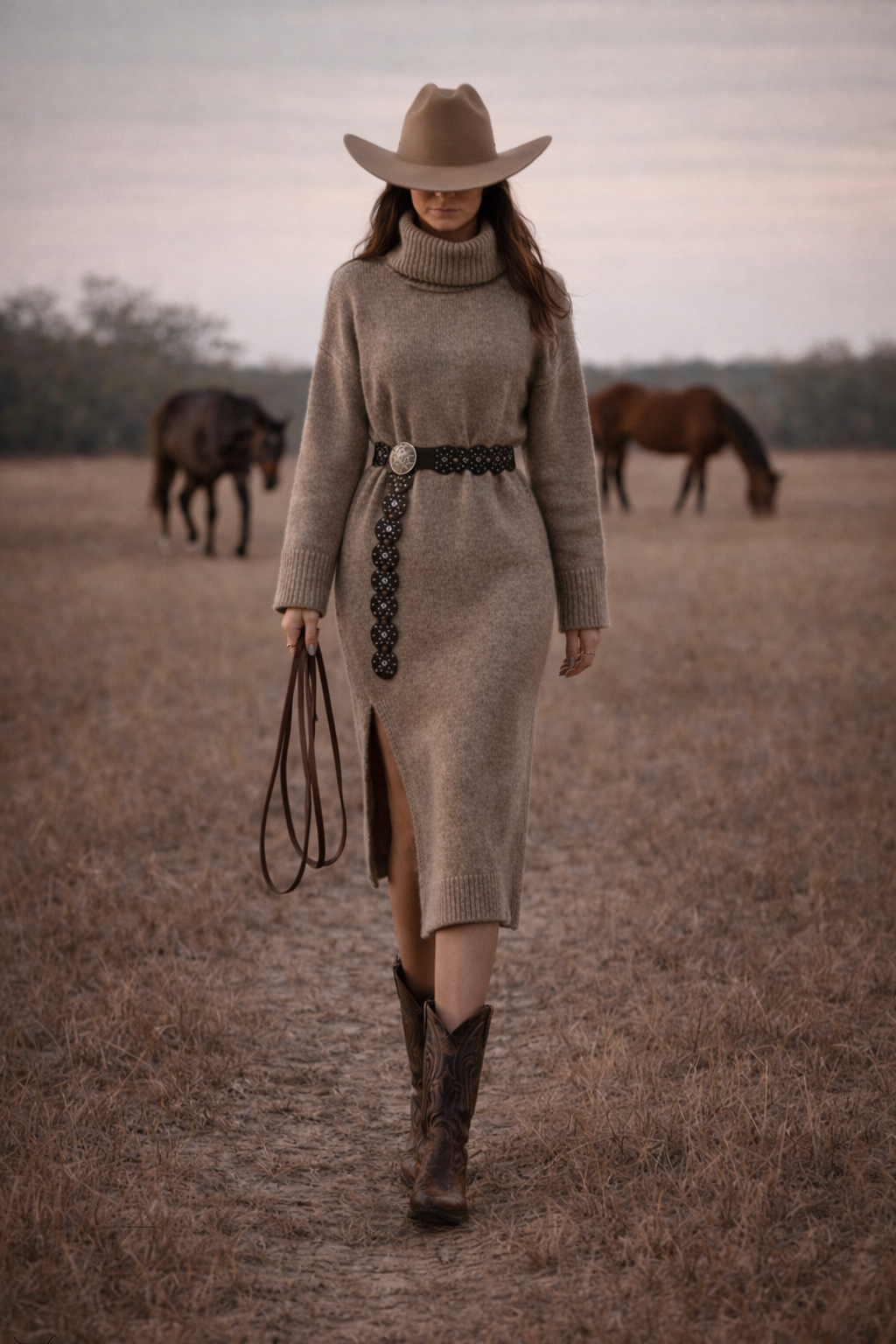 A beautifully soft knit dress designed for slow days and grounded living. Featuring a relaxed turtleneck, flattering midi length, and side slit for easy movement, this dress layers effortlessly with boots and belts. Cozy yet refined, it’s the piece you’ll reach for from crisp mornings to golden evenings.