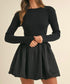 Long sleeve ribbed bodice knit sweater with woven bubble skirt hem mini dress.