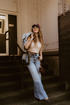 HIGH RISE 90'S FLARE MEDIUM WASH COMFORT STRETCH SINGLE STITCH HEM 5 POCKET STYLE ZIPPER. 99% COTTON, 1% SPANDEX